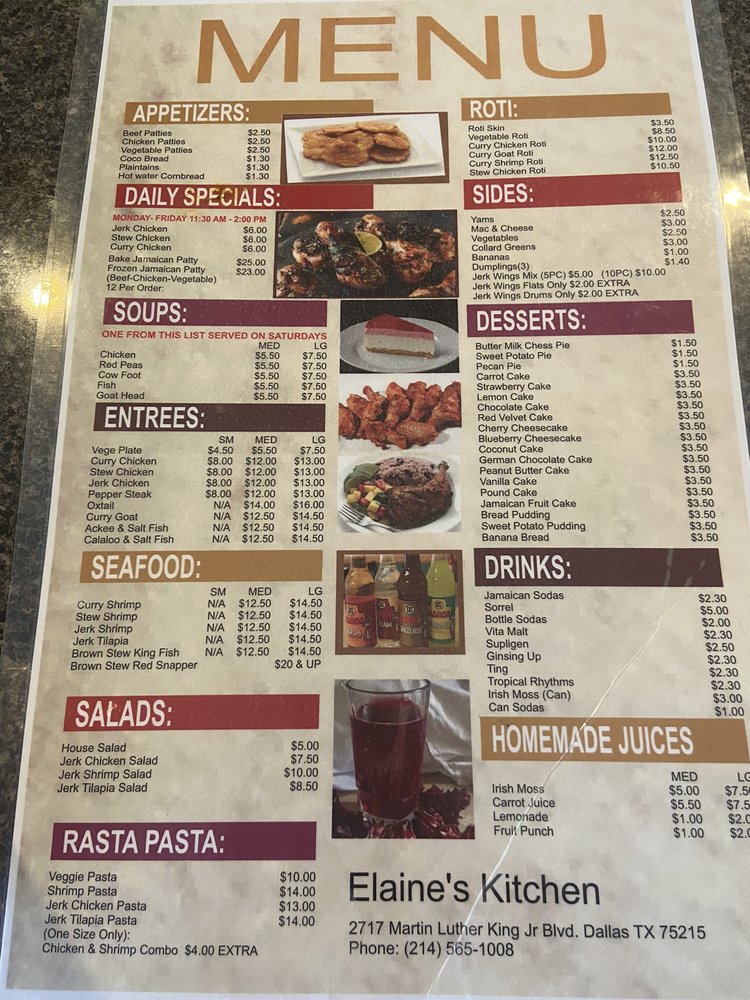 Elaine's Kitchen, a Caribbean gem located in Dallas, TX, offers a wide array of authentic Jamaican dishes. From savory Beef Patties to mouth-watering Oxtails and Curry Goat, their menu is filled with flavorful options. Customers rave about the best Oxtails in town and the delicious Brown Stew Chicken. The $8 lunch special, featuring Curry Chicken and sides, is a steal. The family-owned restaurant provides a quaint atmosphere and friendly service. While some customers have experienced slight service delays, the quality and taste of the food remain exceptional. If you're craving Jamaican or Caribbean cuisine, Elaine's Kitchen is the go-to spot for a satisfying meal reminiscent of the flavors of Jamaica.